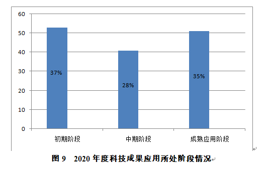从应用情况分析,初期阶段为53项,占可统计数据的36.55%;中期间段为41项,占可统计数据的28.28%;成熟应用阶段为51项,占可统计数据的35.17%。当前成果应用阶段并没有显示出明显差异,应继续加强科技成果转化,推动科技成果向成熟应用阶段发展。