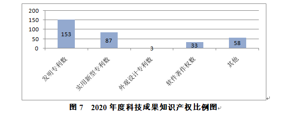 2020年度登记的科技成果中,获得知识产权总数334件。其中,发明专利数153件,占专利总数45.81%;实用新型专利数87件,占专利总数26.05%;外观设计专利数3件,占专利总数0.90%;软件著作权数33件,占9.88%;其他共有58件,占专利总数17.37%。制订标准数15项,其中国际标准3项,国家标准8项,行业标准1项,地方标准3项,企业标准5项。