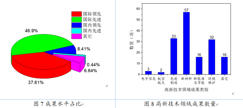 2020年登记的科技成果中,原始性创新183项,国外引进消化吸收创新12项,国内技术二次开发28项。从成果水平来看(图7),国际领先项目85项,占比登记总数的37.61%,国际先进项目106项,占比登记总数的46.90%,国际水平成果整体占比登记成果总数的八成以上。2020年登记的科技成果中,159个项目属于高新技术领域成果,其中新材料、先进制造、环境保护数量较多,分别为57项、33项、32项(图8)。