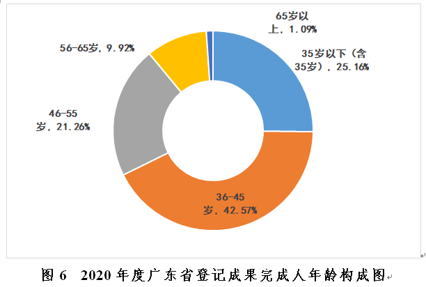 5.青年人员为创新骨干。29985名成果完成人中,35岁以下(含35岁)的7545人次,占总数的25.16%;36~45岁的12764人次,占总数的42.57%,两项合计67.73%。青年人员已成为创新的主要力量。