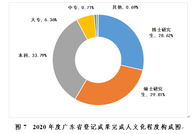 2020年广东省登记成果其完成人共计29985人次,主要集中在45岁以下人员,占研究总人数的67.73%(见图6)。博士研究生、硕士研究生、本科学历分别占总数的28.62%、29.81%、33.79%(见图7)。