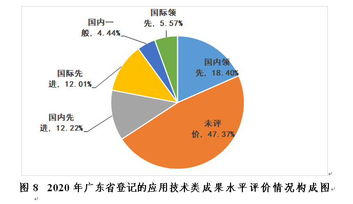 从成果水平看,所登记的应用技术类科技成果中达国际领先的128项、达国际先进的276项、达国内领先的423项、达国内先进的281项、国内一般的102项、未评价的1089项,其比例分别为5.57%、12.01%、18.40%、12.22%、4.44%、47.37%,达到国内先进水平及以上的成果合计48.19%(见图8)。