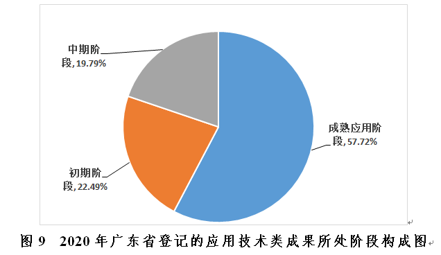 2020年广东省科技成果统计数据显示,在所登记的应用技术类科技成果中,处于初期阶段、中期阶段、成熟应用阶段成果项目数分别为517项、455项和1327项,达到成熟应用阶段的成果占比达57.72%,说明2020年广东省应用技术类成果整体的技术成熟度较高(见图9)。