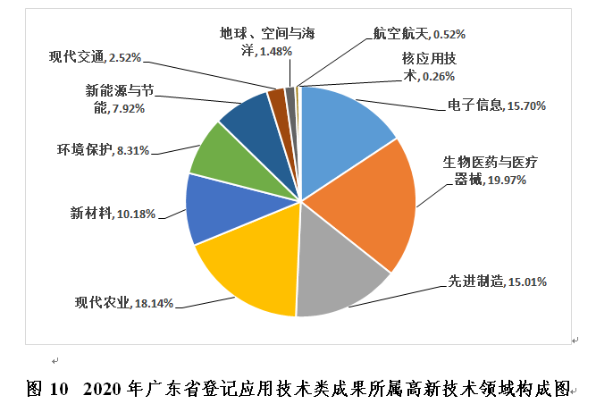 2020年广东省登记的应用技术类科技成果中,高新技术领域成果达到2299项,主要分布在生物医药与医疗器械、现代农业、电子信息、先进制造、新材料五个领域,所占比例依次是:19.97%、18.14%、15.70%、15.01%、10.18%,其他领域占比较低(见图10)。