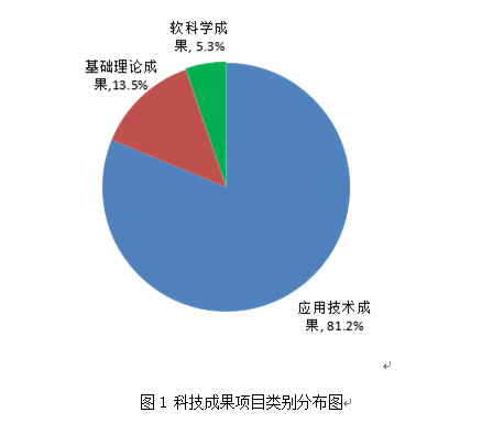 2020年我区共登记科技成果399项,较上年相比,成果登记数量增长了71.2%。其中应用技术成果324项,占81.2%;基础理论成果54项,占13.5%;软科学成果21项,占5.3%。应用技术类科技成果总量较上年增长94.0%,在全区科技成果中占主导,如下图1所示。