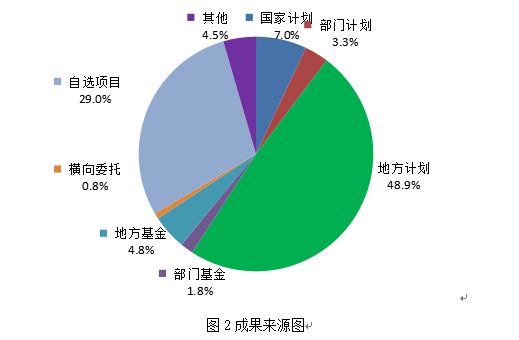 在399项登记的科技成果中,属于政府项目成果(来源于国家计划、地方计划、部门计划、地方基金和部门基金的成果)262项,占65.7%,比2019年提高了10.3个百分点,其中国家科技计划28项,占7.0%;地方计划195项,占48.9%;部门计划13项,占3.3%;地方基金19项,占4.8%;部门基金7项,占1.8%(见图2)。地方计划项目产生的科技成果占比较上年提高了17.6个百分点,增长较快;社会项目成果(来源于国际合作、横向委托、民间基金、自选课题及其他来源的成果)占34.3%,比2019年降低了10.3个百分点。