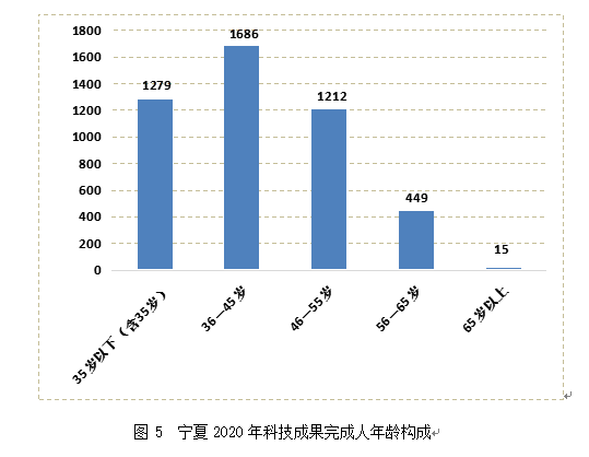 从年龄结构来看,中青年是科技成果研究人员的主体,55岁以下占90.0%,其中45岁以下2965人次,占总人数的比重接近2/3,46-55岁1212人次,占比超过1/4,与2019年相比,科技成果完成人年龄结构变化不大,与全国平均水平相比,宁夏的科技成果完成人更趋于年轻化。