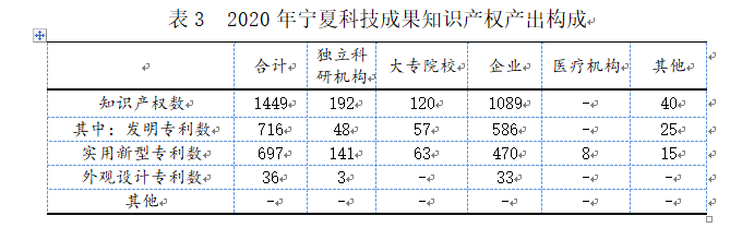 全年登记的科技成果共产生1449项知识产权,较上年度增长1.5倍。其中1413项为发明专利和实用新型专利,占97.5%;外观设计专利占2.5%(见表3)。