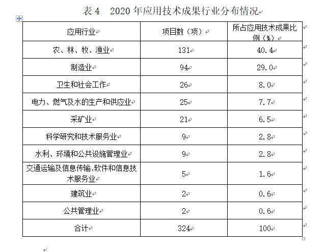 324项应用技术成果按行业分布,农、林、牧、渔业131项、制造业94项、卫生和社会工作26项、电力、燃气及水的生产和供应业25项、采矿业21项、科学研究和技术服务业9项、水利、环境和公共设施管理业9项、交通运输及信息传输、软件和信息技术服务业5项、建筑业2项、公共管理业2项(见表4)。数据表明,我区科技成果主要分布在农林牧渔业,制造业,卫生和电力热力燃气供应等行业。