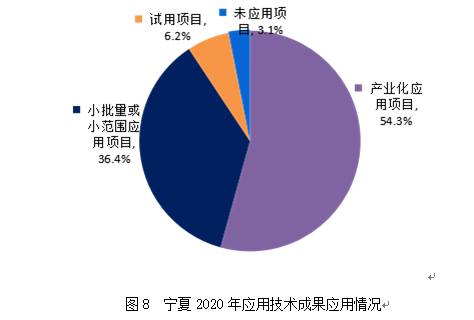 324项应用技术成果中,达到产业化应用水平的有176项,占全部应用技术成果的54.3%;小批量或小范围应用的有118项,占36.4%;试用阶段的有20项,占6.2%;未应用的有10项,占3.1%(见图8)。