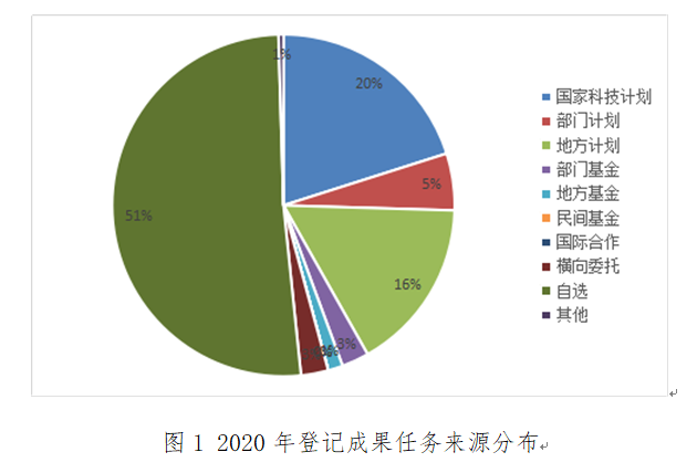 2020年青岛市科技成果以自选项目成果和各级财政支持的各类计划项目为主。其中,自选成果219项,占成果总数的51.17%;各级科技计划项目的成果179项,占成果总数的41.82%。各级科技计划项目中,国家科技计划成果86项,占成果总数的20.09%,部门科技计划项目成果23项,占5.37%,地方科技计划项目成果70项,占16.36%。(见图1)