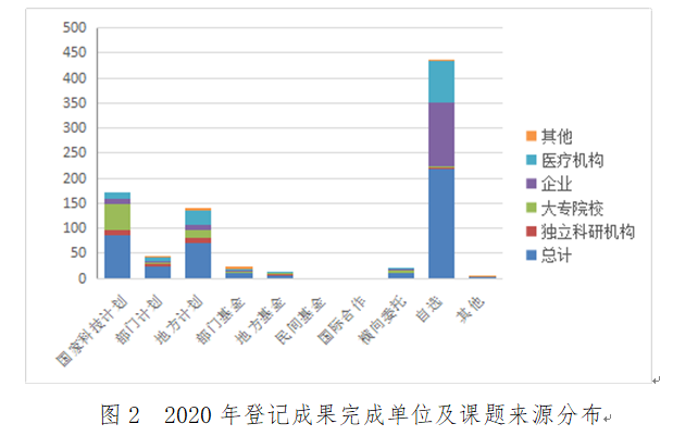 据统计,登记成果第一完成单位分布主要集中在企业。其中企业完成的项目占总项目的36.90%,其中自选课题中企业完成项目占总项目的62.37%,医疗机构自选完成的项目为78项,占总项目的27.96%。(见图2)。