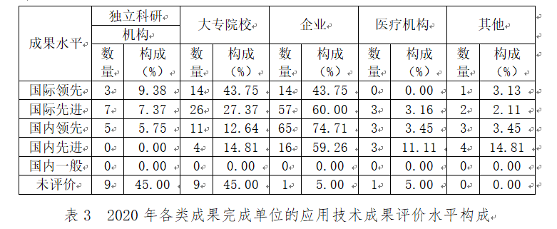 据统计,2020年成果完成单位中,企业成果评价水平相对较高,其国内领先水平以上成果达到136项,明显高于其他类成果完成单位。(见表3)