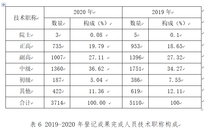 表2 2019-2020年登记应用技术成果评价水平构成及增长变化情况