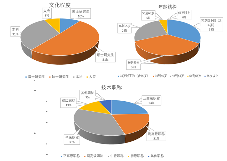 成果完成人296人,按文化程度来分:博士研究生30人次,占完成人总人数的10%;硕士研究生150人次,占完成总人数的51%;本科93人次,占完成人总人数的31%;大专23人次,占完成总人数的8%。按年龄结构来分:35岁以下的(含35岁)有91人次,占完成人总人数的30.74%;36到45岁之间的有100人次,占完成人总人数的33.78%;46到55岁之间的有72人次,占完成人总人数的24.32%;56到65岁之间的有13人次,占完成总人数的7.77%,65岁以上的1人次。按技术职称来分:正高级职称的有67人次,占完成总人数的24%;副高级职称的有58人次,占完成总人数的21%;中级职称的有98人次,占完成总人数的35%;初级职称36人次,占完成总人数的13%;其他职称的有18人次,占完成总人数的7%。