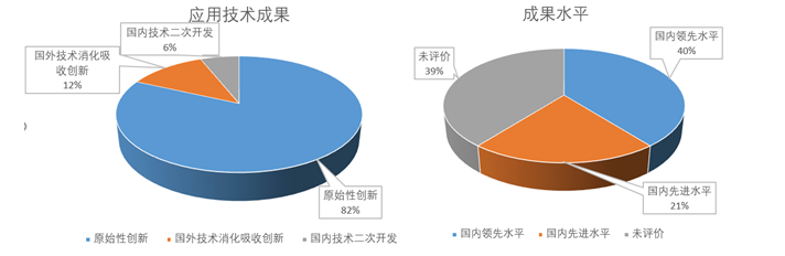 在33项应用技术成果中,属于原始性创新的有27项,占应用技术成果总数的82%;属于国外技术消化吸收创新的有4项,占应用技术成果总数的12;属于国内技术二次开发的有2项,占应用技术成果总数的6.%。在33项应用技术成果中,达到国内领先水平的有13项,占应用技术成果总数的40%;达到国内先进水平的有7项,占应用技术成果总数的21%;未评价13项,占应用技术成果总数的39%。