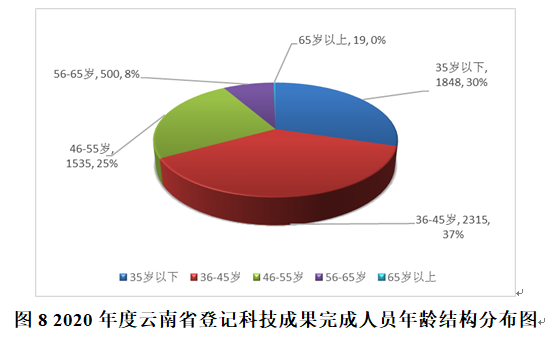在所登记的585项科技成果中,按科技成果完成人员年龄统计:35岁以下1848人,36~45岁2315人,46~55岁1535人,56~65岁500人,65岁以上19人。从年龄结构分布看,55岁以下的科研人员为5698人次,占全部登记成果完成人总数的91.65%。