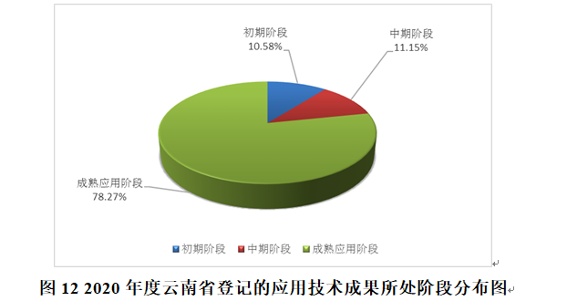在2020年度所登记的520项应用技术成果中,处于成熟应用阶段的成果407项,占78.27%;处于中试或设备的样机、试样等中期阶段的成果58项,占11.15%;处于实验室、小试等初期阶段的成果55项,占10.58%。