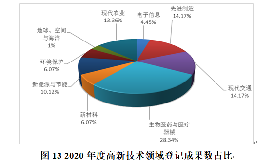 在2020年度所登记的520项应用技术成果中,属于高新技术领域的247项,占应用技术成果的47.5%,其中电子信息11项,先进制造35项,现代交通35项,生物医药与医疗器械70项,新材料15项,新能源与节能25项,环境保护15项,地球、空间和海洋8项,现代农业33项。