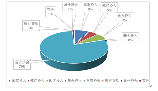 2020年度登记的科技成果中,经费实际投入额262937万元,其中:国家投入21040万元,占8 %;部门投入13005万元,占4.95%;地方投入17773万元,占6.76%;基金投入245万元,占0.09%;自有资金208395万元,占79.26%;银行贷款20万元,占0.01%;国外资金105万元,占0.04%;其他资金2354万元,占0.9%。研发单位自有资金在总资金投入中占有较大的比重。