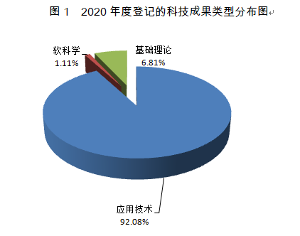 2020年度河南省共登记科技成果2524项,其中应用技术类成果2324项,占全部成果的92.08%;基础理论类成果172项,占全部成果的6.81%;软科学类成果28项,占全部成果的1.11%。