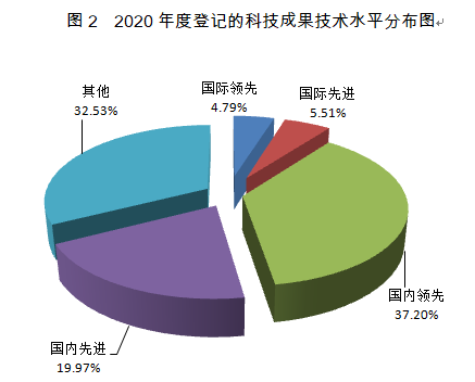 2020年度河南省登记的2524项科技成果中,达到国际领先水平的项目121项,占全部成果的4.79%;达到国际先进水平的项目139项,占全部成果的5.51%;达到国内领先水平的项目939项,占全部成果的37.20%;达到国内先进水平的项目504项,占全部成果的19.97%,其他项目共821项,占全部成果的32.53%。