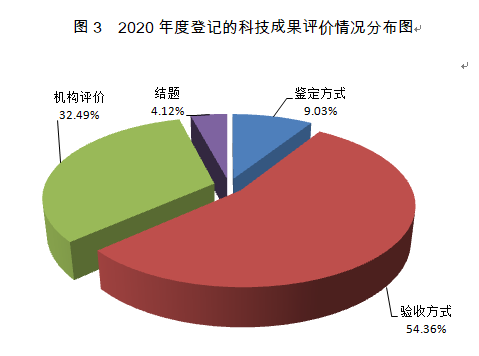 2020年度河南省登记的2524项成果中,通过鉴定方式对成果登记的有228项,占9.03%;通过验收方式登记的有1372项,占54.36%;通过机构评价方式登记的有820项,占32.49%;通过结题方式登记的有104项,占4.12%。其中,发明专利授权数有1500项,其中企业发明专利授权数有764项,占发明专利授权数的50.93%。