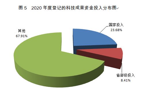 2020年度河南省登记的2524项成果中,共投入资金69.0028亿元,其中国家投入16.3424亿元,占23.68%;省部级投入5.8001亿元,占8.41%;其他资金投入46.8603亿元,占67.91%。项目资金投入主要来自于项目承担单位。