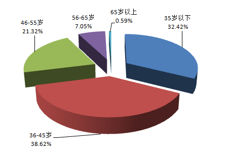 项目完成人中35岁以下人员6980人,占32.42%;36-45岁人员8316人,占38.62%;46-55岁人员4591人,占21.32%;56-65岁人员1517人,占7.05%;65岁以上人员127人,占0.59%。