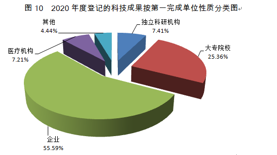 2020年度河南省登记的2524项成果中,独立科研机构完成的187项,占7.41%;大专院校完成的640项,占25.36%;企业完成的1403项,占55.59%;医疗机构完成的182项,占7.21%;其他性质单位完成的112项,占4.44%。
