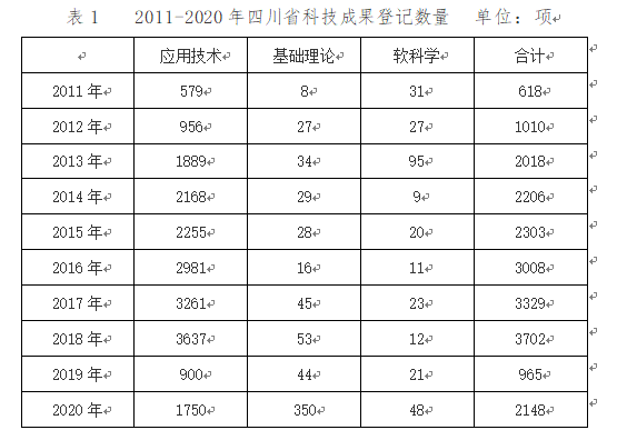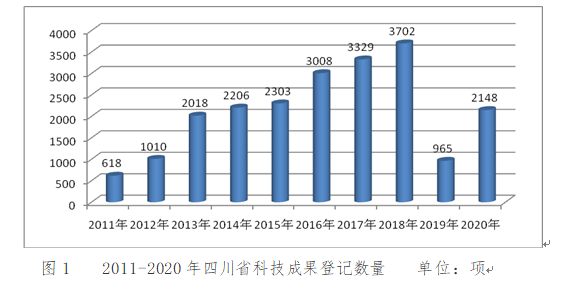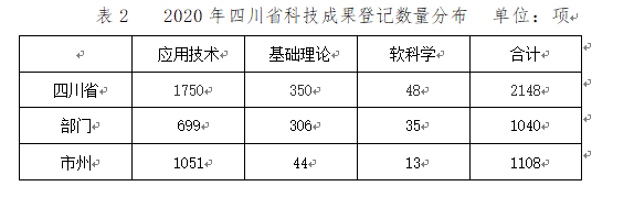2020年四川省科技成果登记2148项,同比增长122.59%,其中部门登记成果1040项,市(州)登记成果1108项。