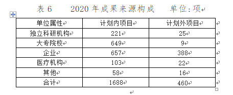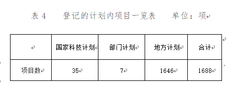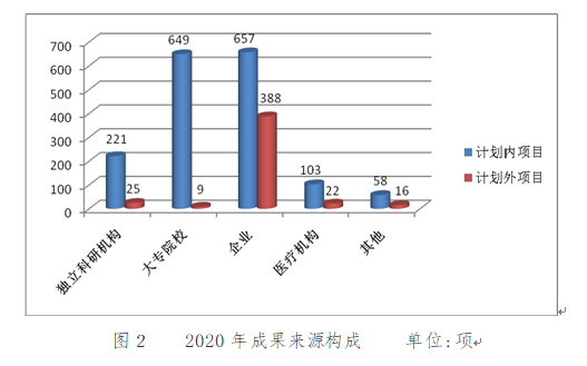 2020年登记科技成果来自于国家、部门和地方科技计划支持产生的成果1688项,占登记成果的78.58%;计划外460项,占登记成果的21.42%。