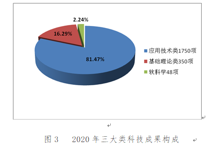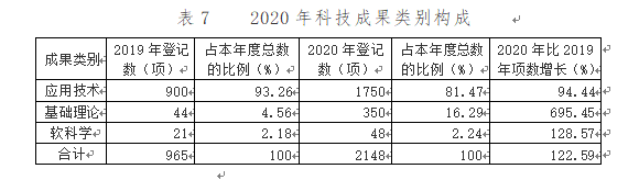 三大成果类别所占比例与去年相比,2020年度登记的应用技术类成果1750项,增长了94.44%;基础理论类成果350项,增长了695.45%;软科学类成果48项,增长了128.57%。