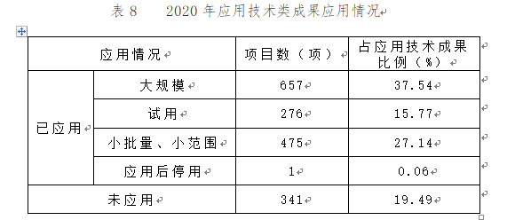 2020年度登记的应用技术类科技成果1750项,其中已应用的1409项,占应用技术类成果的80.51%;未应用的341项,占19.49% 。