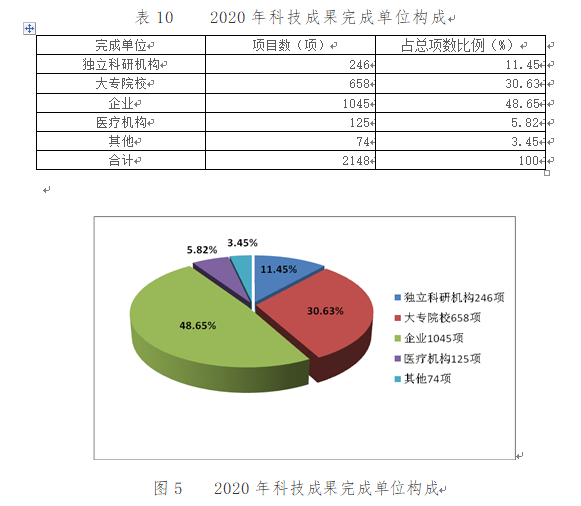 2020年登记的科技成果第一完成单位按属性归为五大类,各类项数、所占比例为:独立科研机构246项,占本年度成果第一完成单位的11.45 %;大专院校658项,占本年度成果第一完成单位的30.63 %;企业 1045项,占本年度成果第一完成单位的48.65 %;医疗机构125项,占本年度成果第一完成单位的5.82 %;其他74项,占本年度成果第一完成单位的3.45 % 。