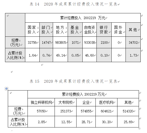 注:科技成果的经费投入是指科技成果在研究、开发、应用和推广过程中实际投入的全部资金。由于科技成果从投入研究到形成成果历时数年,且研究时间跨度不等,所以以上数据反映的不是当年经费投入情况,而是2020年度登记的科技成果某阶段经费投入情况。