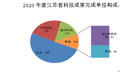 2020年,江苏省各类科技计划顺利实施,科技创新能力持续增强,突破了一批卡脖子重点技术,科技成果不断涌现,企业牵头完成的成果数量逐年攀升,完成人呈现年轻化专业化曲线。2020年全年共登记科技成果859项,比上一年度增长17%。企业完成435项,占比超过50%,位列第一,企业已成为科技成果主力军,其中科研机构转制企业完成32项;位列第二的是大专院校,完成195项;紧随其后的是医疗机构,完成126项;独立科研机构完成63项,其他单位完成40项。