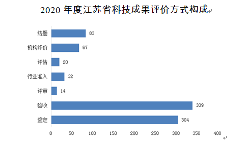 2020年度江苏科技成果评价仍然以鉴定与验收为主,其他为辅助模式。其中,鉴定项目304项,占总量的35%;验收项目339项,占总量的39%;评审项目14项;行业准入项目为32项;评估项目为20项;机构评价项目为67项;结题项目83项。