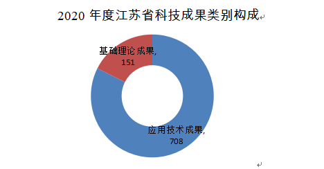 2020年江苏科技成果类别仍然以应用技术成果为主,共计708项,占82%;基础理论成果151项,占18%。