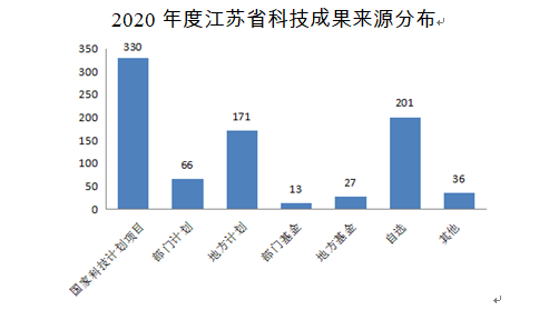 2020年江苏省科技成果登记总数中,课题来源于国家科技计划项目330项,比上一年度增长38%,其中:科技重大专项16项,自然科学基金171项,高技术发展研究计划1项,其他125项。课题来源除了国家科技计划外,部门计划66项,地方计划171项,部门基金13项,地方基金27项,国际合作2项,横向委托12项,自选201项,其他36项。