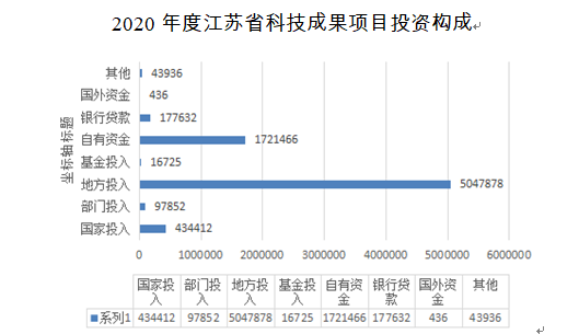 2020年江苏科技成果经费实际投入总额为7540337万元,其中,国家投入434412万元,占6%;部门投入97852万元,地方投入5047878万元,占67%;基金投入16725万元,自有资金1721466万元,占23%;银行贷款177632万元;国外资金436万元;其他43936万元。