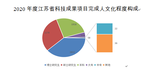 2020年江苏科技成果完成人的文化程度博士研究生人数首次占据第一,标志着我省科技人才层次正不断攀升,硕士研究生学历以上的完成人占总完成人数的69%:博士研究生2832人次,硕士研究生2278人次,大学本科1918人次,此外,大专310人次,中专22人次,其他36人次。
