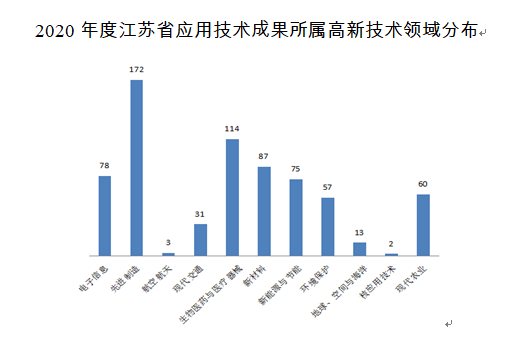 2020年江苏应用技术成果所属高新技术领域分布,电子信息78项,先进制造172项,航空航天3项,现代交通31项,生物医药与医疗器械114项,新材料87项,新能源与节能75项,环境保护57项,地球、空间与海洋13项,核应用技术2项,现代农业60项。