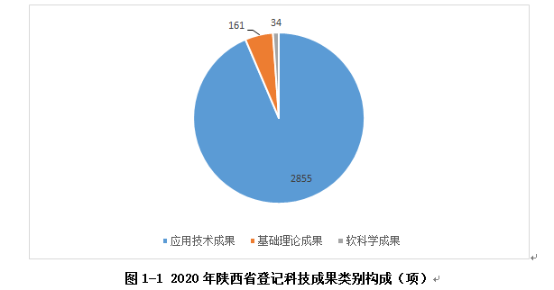 2020年陕西省登记的3050项科技成果中,应用技术成果2855项,占登记成果总数的93.61%;基础理论成果161项,占5.28%;软科学成果34项,占1.11%(图1-1)。