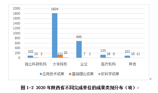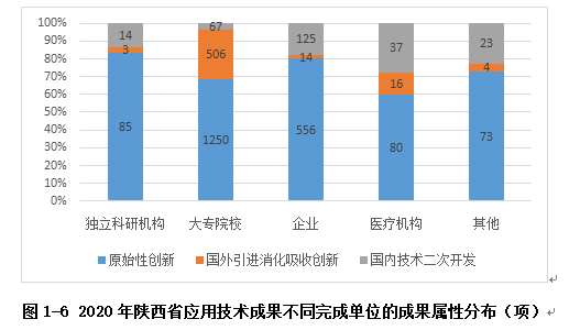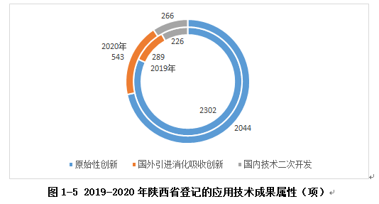 2020年陕西省登记的原始性创新成果有2044项,占总登记成果的71.64%,较2019年的2302项减少了11.21%;国外引进消化吸收创新成果543项,占19.03%,较2019年的289项增长了87.89%;国内技术二次开发成果266项,占9.32%,较2019年的226项增加了17.70%(图1-5)。