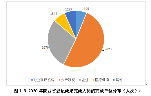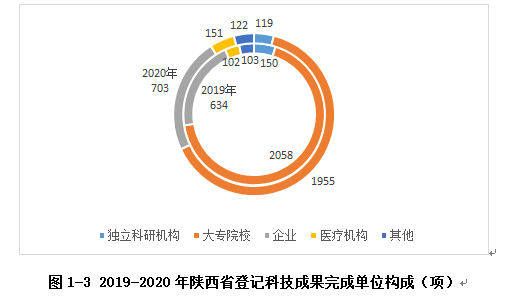 2020年陕西省登记的科技成果中,大专院校完成的成果数达1955项,占登记总数的64.10%;企业完成703项,占23.05%;独立科研机构完成119项,占3.90%;医疗机构完成151项,占4.95%;其他类型单位完成122项,占4.00%。相较于2019年,医疗机构完成的成果数增加了48.04%;而独立科研机构完成的成果数下降幅度较大,下降了20.67%(图1-3)。