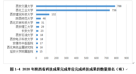 进一步,据2020年数据统计,在3050项科技成果中,科技成果完成单位以西安交通大学和西北工业大学为主,二者之和占2020年所有科技成果登记总数的49.97%。其中,第一名为西安交通大学,完成数为788项,占科技成果登记总数25.84%;第二名为西北工业大学,完成数为736项,占24.13%;第三名为西安建筑科技大学,完成数为132项,占4.33%。科技成果完成数量的单位排名如图1-4所示。