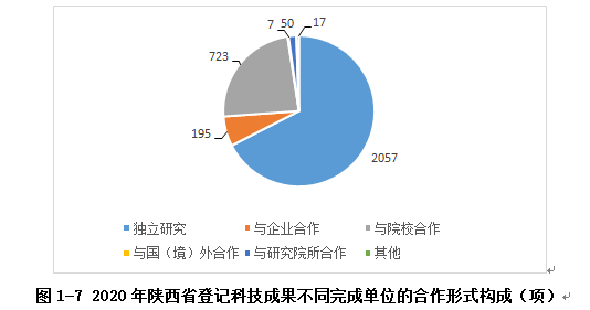 2020年陕西省登记的科技成果中,独立研究、院校合作二者之和占所登记的科技成果总数的91.18%。其中,独立研究有2057项,占67.46%;与院校合作有723项,占23.71%;与企业合作有195项,占6.40%;与研究院所合作有50项,占1.64%;与国(境)外合作有7项,占0.23%;其他合作方式有17项,占0.56%(图1-7)。