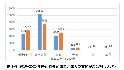 从文化程度结构来看,博士研究生5697人次,占总人次的29.63%;硕士研究生7589人次,占39.47%;本科学历5055人次,占26.29%;大专学历693人次,占3.60%;中专及其他学历共191人次,占0.99%。其中,硕士研究生人数较2019年有所下降,减少了27.80%;本科及以上学历占比之和为95.40%,与2019年的96.18相比有所减少(图1-9)。