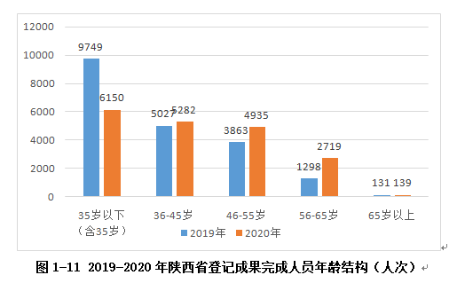 从2020年登记的科技成果完成人员年龄结构看,35岁以下(含35岁)的科技人员是完成成果的主力军,共6150人次,占全部人次的31.99%;36-45岁人员为5282人次,占27.47%;46-55岁人员为4935人次,占25.67%;56-65岁人员为2719人次,占14.14%;65岁以上人员为139人次,占0.72%。其中,35岁以下(含35岁)的科技人员数量较2019年减少了36.92%,其余年龄段的科技人员数量均有所增长(图1-11)。